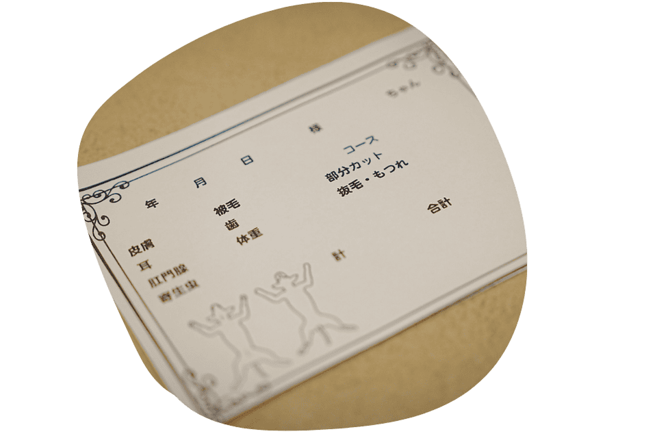 各コースには、爪切り、耳掃除、足裏、足先カット、肛門腺絞りを含んでいます。
